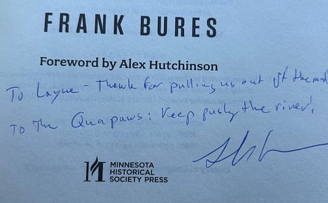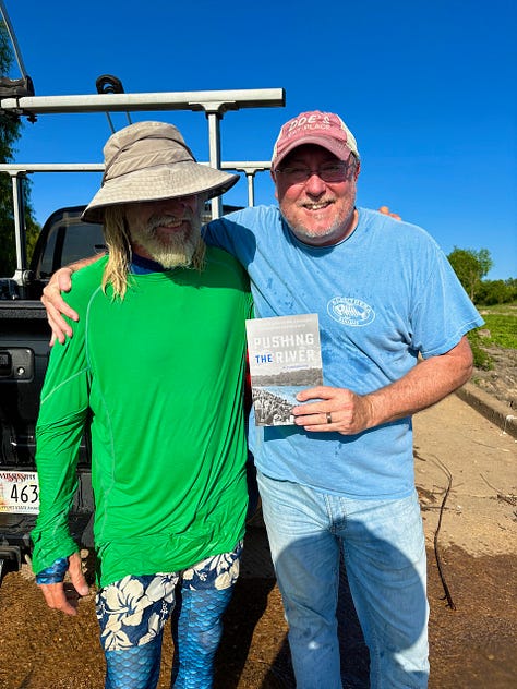 Jean Canôt passes Pushing the River, a gift from author Frank Bures, downstream to the "Water Opossum" Layne Logue (Quapaw Vicksburg). In true voyageur tradition, gifts get hand delivered not by post, but hand-to-hand! (Note: more reliable than USPS, UPS or FedEx!).