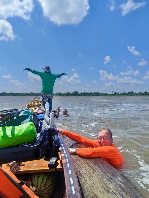Jean Canôt is also a playful person who loves to swim. Matt Sutton joined us for a swim around the Montezuma Eddy during expedition resupply. During lunch stop and water sampling at the mouth of the St. Francis River, Watermelon Water Frisbee was invented! This involves skipping watermelon rinds to each other over the water. (I didn't get any photos because I was playing the game too!)