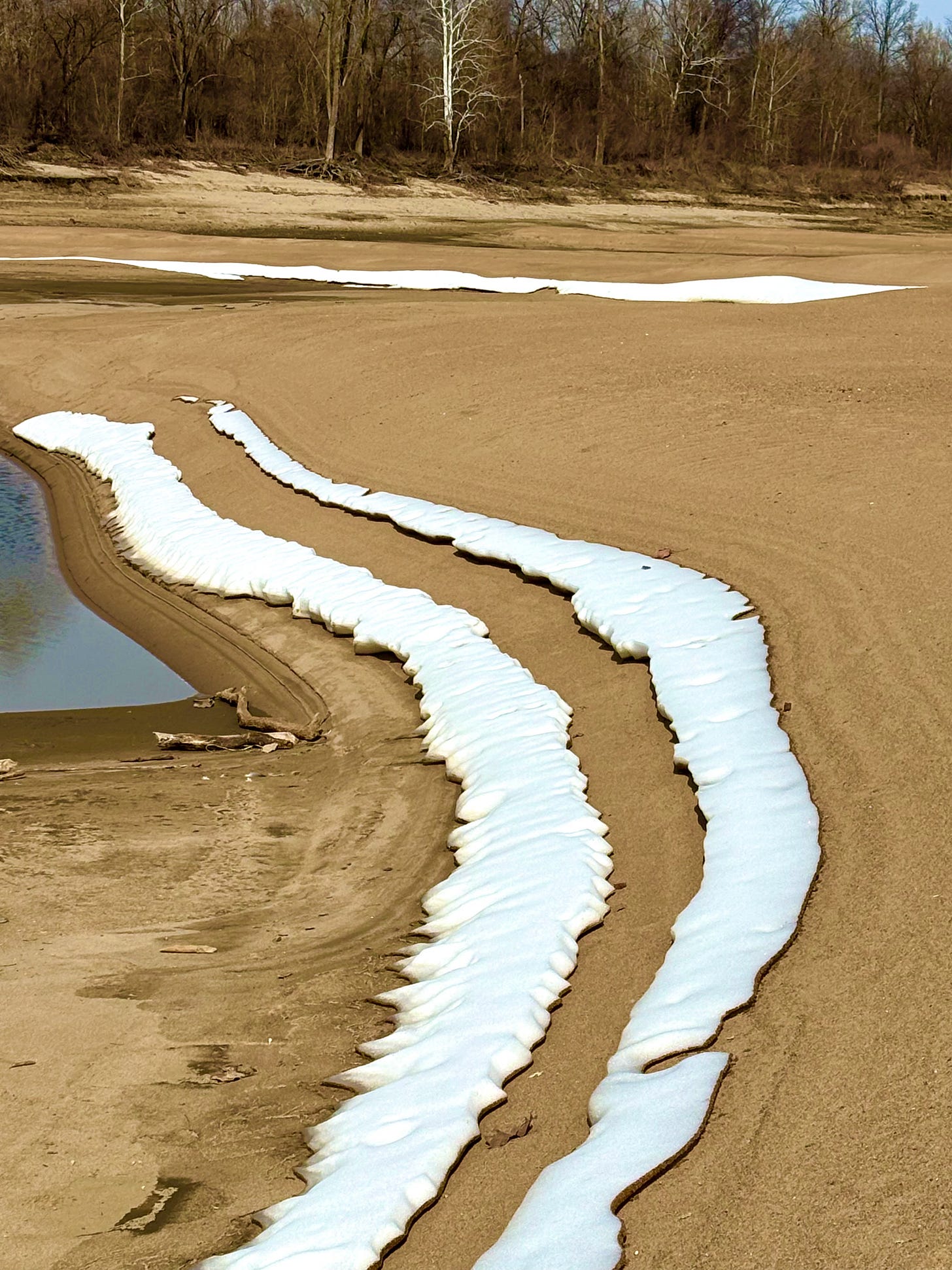 Where did the snow and speckled geese survive the winter onslaught? I set out on paddle board to explore. Yesterday on West Montezuma Island I discovered one secret refuge location: on the giant expanses of sand near water's edge. River level Helena gage 4.7 and dropping. During low water the sandbar turns into a small desert of several thousand acres, spread out along 3-4 miles of the river. Here on ocean-beach sized fields of open sand, thousands of snow and speckled geese had apparently hunkered down in a place I had never before witnessed these geese to choose: on the sandbar. (Normally snow and speckled geese make landings only in wide open winter fallow fields of corn, soybeans, rice or wheat, grazing on the grain remains as they do so). Never ever had I witnessed them settling down on our big island sandbars. But this was a different scenario. Winter storm "Fern" she came to be called. Not at all gentle like the name would seem to suggest! Fern was a scale stronger, with longer-lasting effects than any that I have ever previously experienced. And I have lived in the Mississippi Delta since 1991. (Well, one other just as bad -- the great ice storm of 1994 shut down Clarksdale for 2 weeks.) On Montezuma the snow drifts were polkadotted with salad bowl-sized indentions, and holes. Some like a bowl have been pushed down in the snow. Others sandy-bottomed as if cut out with a cookie cutter. At the bottom of each hole was a small pile of curled up goose poop. And where the snow and ice had melted, the giant sandbars were littered with thousands of piles of goose poop, and circular markings left over from the melting ice. Beyond the doubt, there were casualties. But I was surprised not to find more. I did find one dead snow goose, partially eaten. And I saw maybe a dozen locations with nothing but feathers and pieces of wing. Coyote or bobcat tracks all over in same vicinity. Evidently those predators had taking advantage of the situation for their own survival. Our bald eagle eagle friends could be seen across the river, standing in the high branches of their favorite cottonwood tree. They might have made a few meals also. As I paddled out I scared a single goose from perch on rip rap water's edge, its legs dangling uselessly below, apparently frozen from arctic cold. In town I discovered one cardinal dead by Sunflower River edge, and eaten. I was terrified of finding mass die-offs following storm. But creation is tough, and time-hardened resilient. I saw many friends doing fine, friends who I had feared for: owls, eagles (and the squirrels who live in my back yard trees, in town!). (Note: one day later Humming-Bear and I paddled out to Is. 62 and found similar goose cavities on the giant sandbars there. Also a few piles of feathers where someone got munched. And lastly, a female wood duck who lost use of one of her legs, and was sadly but defiantly maintaining her last station of life in the eddy at base of Is. 63.)